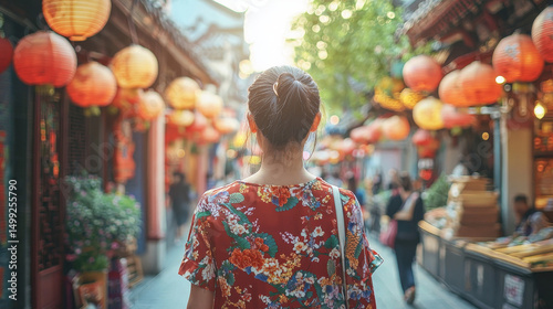 © anjum, Fototapeta premium China food market street in Beijing. Chinese tourist walking in city streets on Asia vacation tourism. Asian woman travel lifestyle panoramica banner
