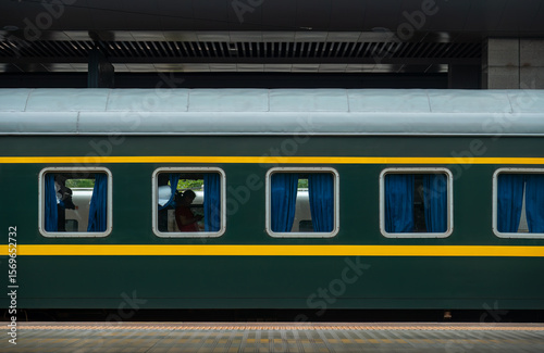 © 子程 龚, Fototapeta premium China Railway, green train coach docked at the platform