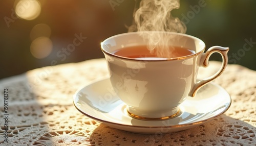 Fototapeta premium China teacup filled with steaming English breakfast tea, on vintage lace tablecloth