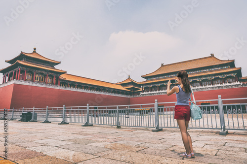 © Maridav, Fototapeta premium China travel lifestyle. Asian woman taking smartphone picture of Beijing tourist attraction, ancient dynasty building.