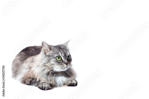 © Александр Беспалый, Obraz premium chinchilla cat fluffy striped gray lies and looking to with big eyes, feline animal isolated on a white background with a copy space.