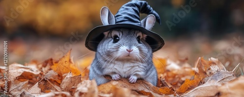 © Kedsara, Obraz premium Chinchilla wearing a witch hat and cloak, casting tiny spells, witch chinchilla, magical small pet