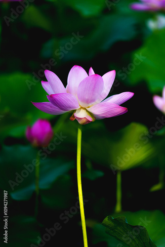 © Kem, Obraz premium Chinese beauty: Pink lotus in sunlight with green leaf