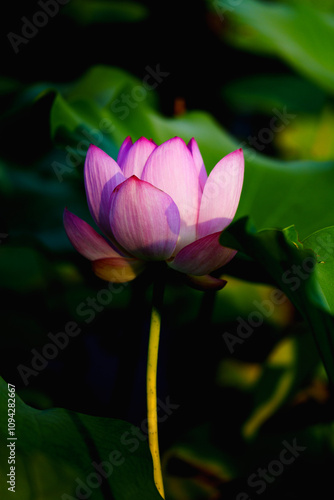 Obraz premium Chinese beauty: Pink lotus in sunlight with green leaf