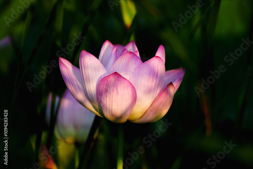 Obraz premium Chinese beauty: Pink lotus in sunlight with green leaf