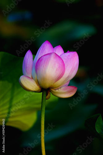 © Kem, Obraz premium Chinese beauty: Pink lotus in sunlight with green leaf