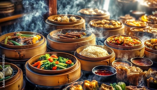 © ma, Fototapeta premium Chinese dim-sum in bamboo steamers on wooden table with rising steam.