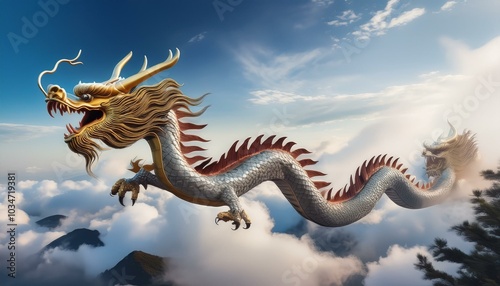 Obraz premium Chinese dragon flying high above and in the clouds; a Chinese mythical...