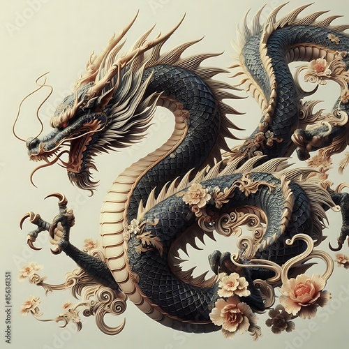 © AI ARLI, Fototapeta premium Chinese Dragon Sculpture with Floral Decorations