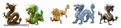 © SRITE KHATUN, Obraz premium Chinese dragon set including bronze, green, gold, blue, and ornate patterned styles isolated. Cultural symbols and mythological creatures.
