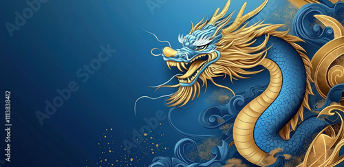 Obraz premium chinese dragon with intricate details, symbolizing the zodiac sign year of the dragon, happy new year 2025 celebration artwork on navy blue background, copy space for text