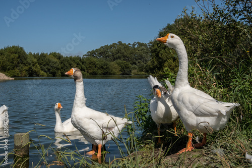 © Barry, Obraz premium Chinese geese group portrait by a pond in summer