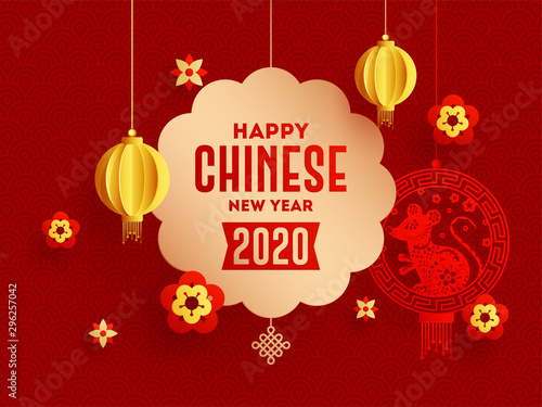 © Abdul Qaiyoom, Naklejka premium 2020 Chinese Happy New Year greeting card design with hanging rat zodiac sign and paper cut lanterns decorated on red seamless circle wave background.