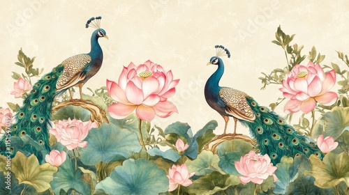 Naklejka premium 84.Chinese-inspired vintage seamless border with pink lotus flowers, lush rose blooms, and majestic peacocks, framed by intricate leaves and a soft pastel background, evoking elegance and traditional