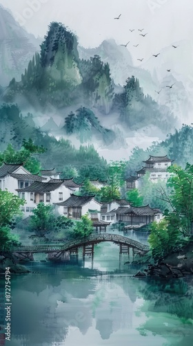 Fototapeta premium Chinese landscape painting, high mountains, rivers, and villages