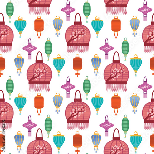 © Vectorvstocker, Fototapeta premium Chinese lantern light paper holiday celebrate asian graphic celebration lamp seamless pattern background vector illustration.