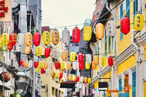 Obraz premium Chinese lanterns strung across colourful shopfronts in the alleyways of Kwai...