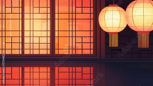 © Nattanon, Fototapeta premium Chinese new year background. Serene interior with glowing lanterns and warm sunset hues reflecting on a tranquil surface.