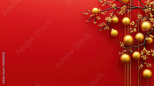 Obraz premium Chinese New Year background with golden decorations on a red wall, minimalist...