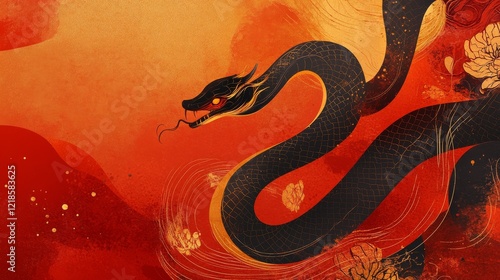 Obraz premium Chinese New Year 2025 banner, golden snake illustration, traditional red and gold tones, oriental-inspired patterns, Chinese zodiac imagery, auspicious design elements, festive celebration theming,