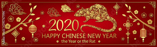 © leezarius, Fototapeta premium Chinese new year 2020 card with gold rat zodiac and abstract flower texture on red background. Winter holidays. Horizontal banner. Design for poster, invitation, card, banner, flyer. In flat style.