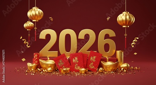 © ParvinPro, Naklejka premium Chinese new year 2026 celebration with gold decorations and red envelopes