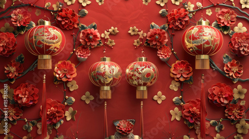 © NooPaew, Fototapeta premium Chinese New Year decorations, traditional festive theme, vibrant colors, rich red and gold details, detailed cultural elements, high-resolution illustration