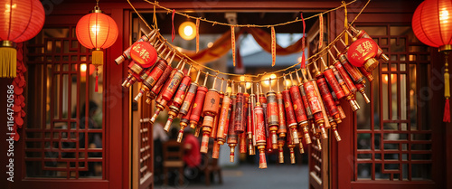 Obraz premium Chinese New Year decorations with lanterns and firecrackers