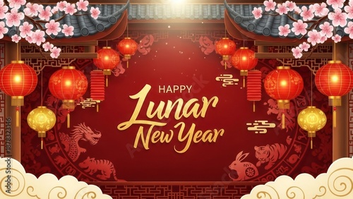 Naklejka premium Chinese New Year decorations with red lanterns and dragon patterns on a red...