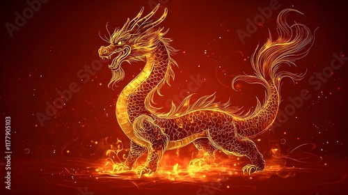 © Ryulookyee, Obraz premium chinese new year dragon Cartoon illustration of a Chinese dragon head with red hair and feathers, reminiscent of a colorful bird or mythical animal