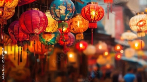 Naklejka premium Chinese New Year Festivity: A Blurred China Town Backdrop with a Vibrant...