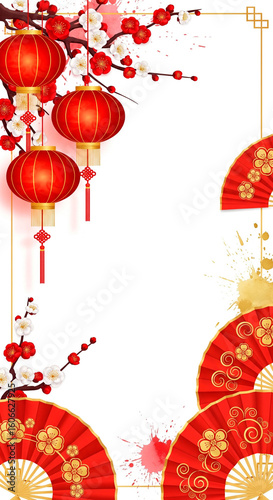 © Selena.art, Naklejka premium Chinese New Year Frame: Festive Cards, Decor, or Cultural Ads with Lanterns and Fans