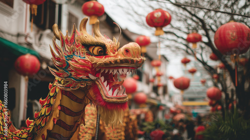 Naklejka premium Chinese New Year Golden Dragon Head Decoration with Red Lanterns Street Festival Celebration