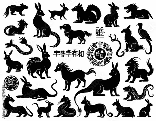 Naklejka premium Chinese New Year horoscope animals, 2023 black silhouette rabbit, dragon,...