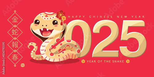 Fototapeta premium Chinese New Year 2025 illustration, cute laughing snake on red background,...