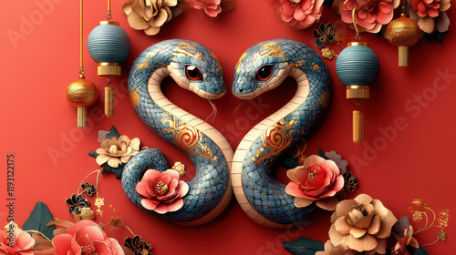 © Aiinwonderland, Obraz premium Chinese new year illustration of year cartoon cute snake with floral pattern in red background