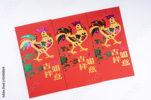 © annuar83, Obraz premium Chinese New year,red envelope packet (ang pow) on white background. Chinese character Translation: Wishing you good fortune and your wishes come true