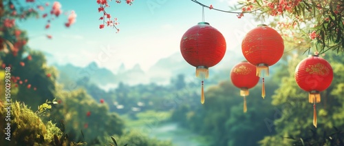 Fototapeta premium Chinese New Year, red lanterns hanging on a blue background, a traditional...