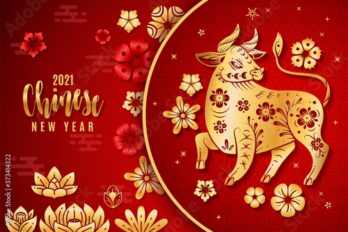 Fototapeta premium Chinese new year 2021. Traditional poster with red and gold ox, flower and asian elements, zodiac bull year oriental horoscope vector background