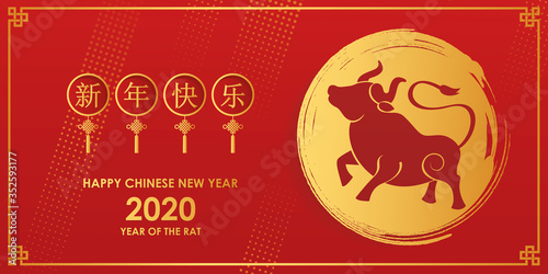 Fototapeta premium Chinese New Year 2021 year of the bull. postcard red and gold paper cut bull