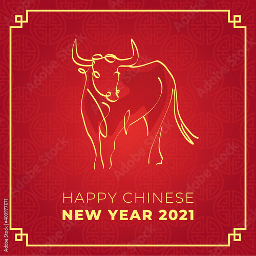 Fototapeta premium Chinese new year 2021 year of the cow, red and gold line art character,...