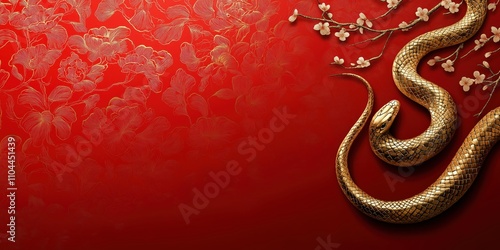 Obraz premium Chinese new year 2025 year of the Snake. Golden snake entwined with floral branches on a bold red textured background