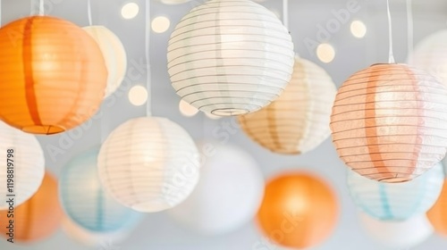 Fototapeta premium Chinese Paper Lanterns Hanging from Ceiling with Blurred Background and Soft...