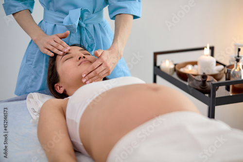 © alfa27, Obraz premium Chinese pregnant woman receiving osteopathic or chiropractic treatment on face in clinic, side view on female lying on bed with naked tummy getting massage procedure, relaxing with eyes closed