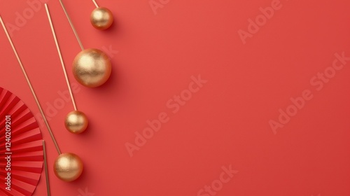 © Katewaree, Obraz premium Chinese Red Background with Gold Elements and Decorative Fan for Festive Celebration Design