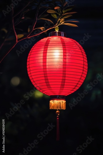 Fototapeta premium Chinese Red Lantern Glowing Brightly at Night Against Dark Backdrop Symbolizing Happiness During Chinese New Year Celebration