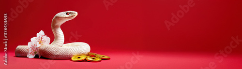 Fototapeta premium Chinese snake symbolism. White snake on a vibrant red background with decorative elements.