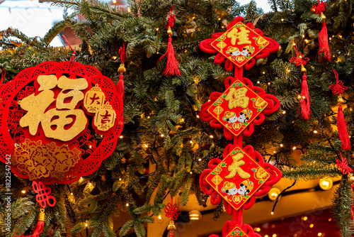 Naklejka premium Chinese-style Christmas tree toys and lights on green Christmas tree. Festive background. Chinese New Year in Moscow. High quality photo