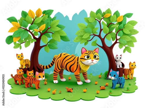 © Illustrations, Naklejka premium chinese zodiac year of the horse,3d animals cartoon in the forest,birds on tree,set of animals