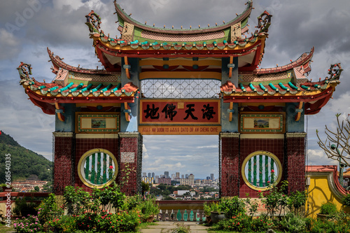 Fototapeta premium Chinesisches Tor mit Blick auf George Town, Penang, Malaysia